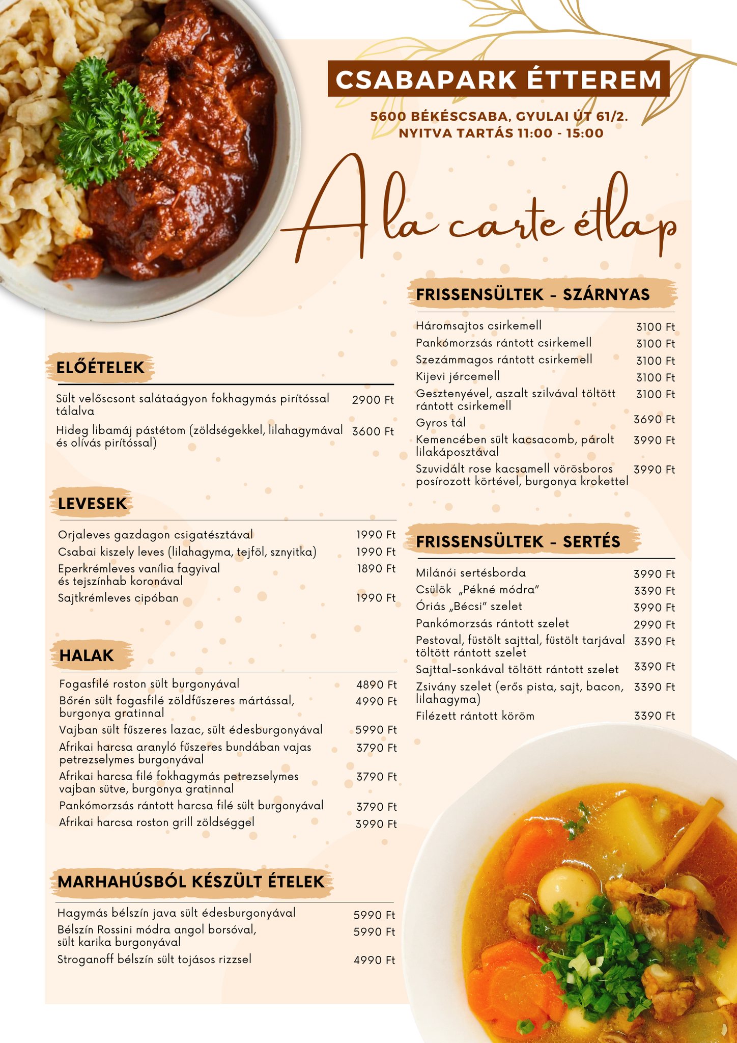 A CsabaPark Étterem a park egyik legkedveltebb gasztronómiai helyszíne, ahol a házias ízek és a modern konyhai megoldások találkoznak. Vendégeinket à la carte fogásokkal, változatos napi menükkel és hangulatos, tematikus svédasztalokkal várjuk, amelyek minden alkalomhoz különleges ételélményt nyújtanak. Az étterem barátságos, tágas tere ideális választás családi ebédekhez, céges rendezvényekhez vagy nagyobb összejövetelekhez is. A természetközeli környezet és a gondosan összeállított ételkínálat együtt teszi a CsabaPark Éttermet a város egyik legízletesebb és leginspirálóbb találkozóhelyévé.