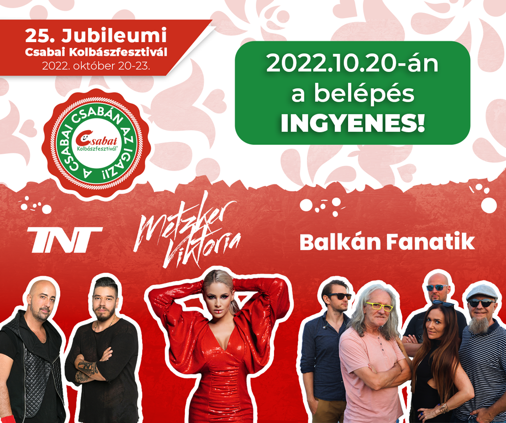 ? Ne feledd, a 25. Jubileumi Csabai Kolbászfesztivál csütörtöki nyitónapján a belépés mindenki számára INGYENES! ?